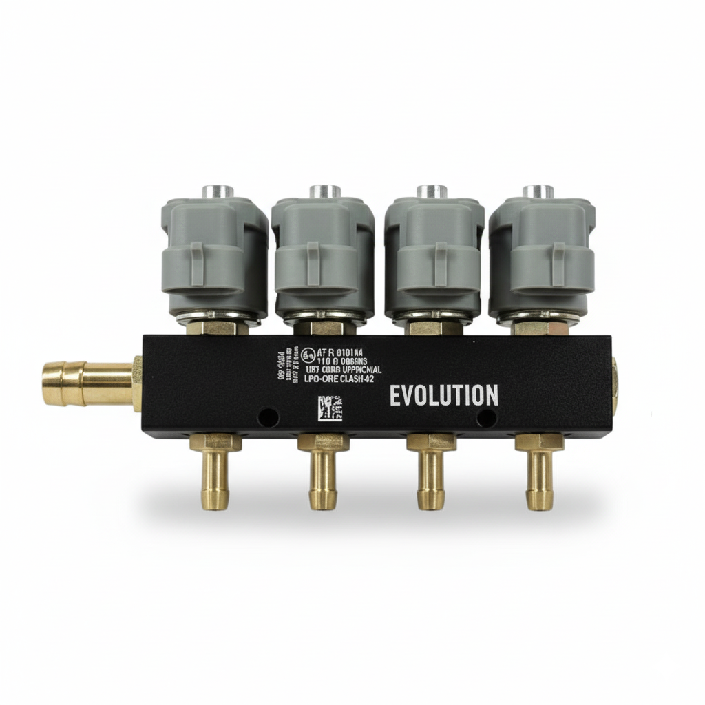 Riel VALTEK para 4 cilindros con resistencia de 2 Ohms. Ofrece un control preciso del suministro de gas, garantizando economía y potencia en vehículos GNV/GLP.