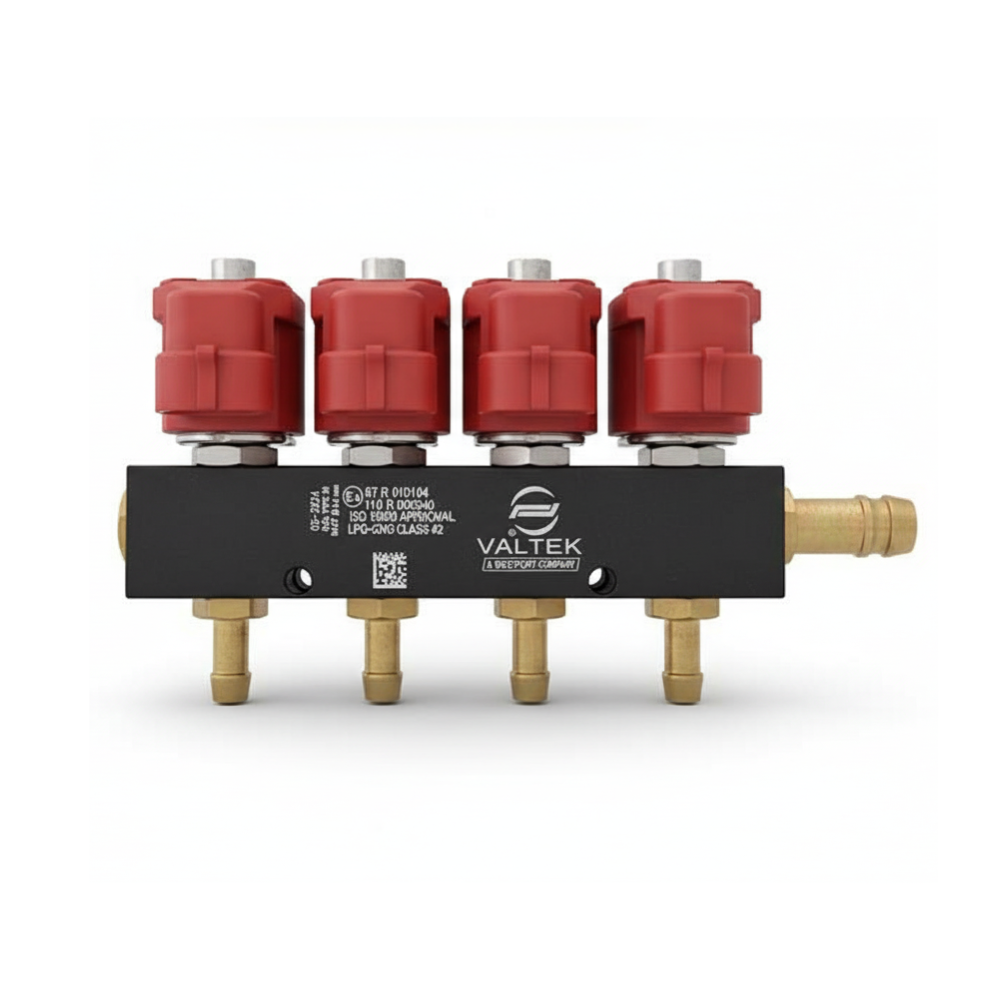 El riel, es un inyector de gas VALTEK para sistemas GNV/GLP de 4 cilindros. Resistencia de 3 Ohms, ideal para instalaciones de alto rendimiento.